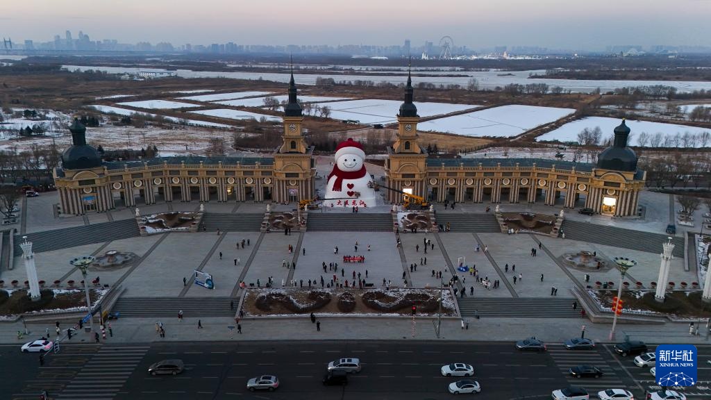 这是2025年12月15日在哈尔滨市群力音乐公园拍照的大雪人(无人机相片)。