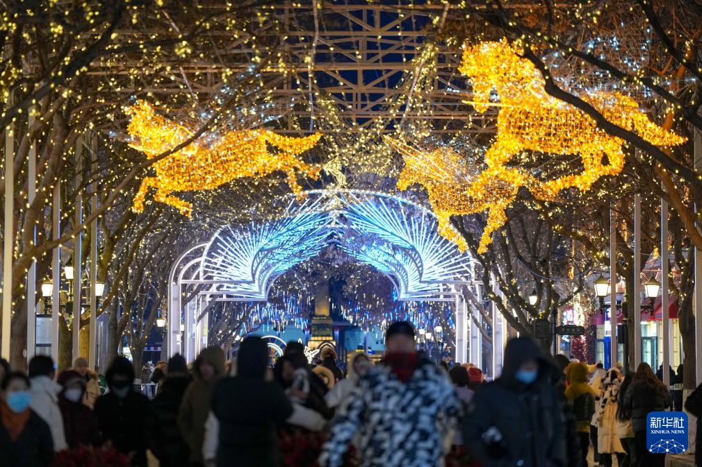 这是哈尔滨中心大街上拍照的以“冰雪迎宾 瑞马迎新”为主题的构思灯饰(2025年12月16日摄)。