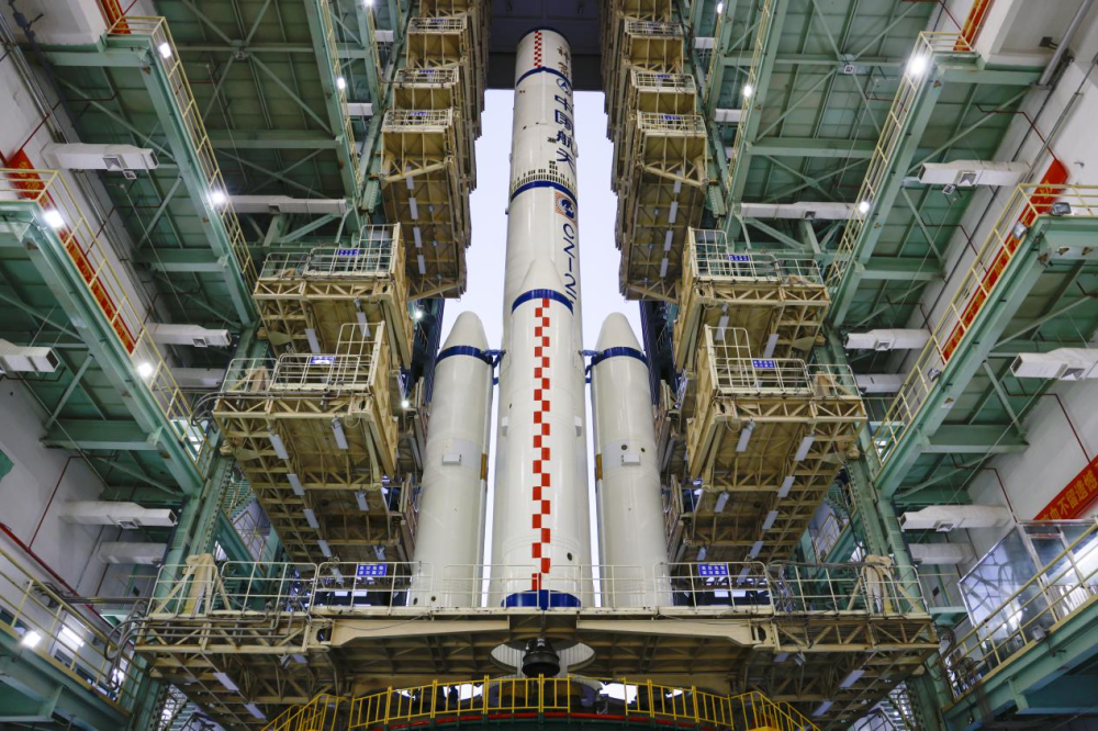 ↑长征二号F遥二十二运载火箭转移到待发测验工位(2025年11月8日摄)。新华社发(李明堂 摄)