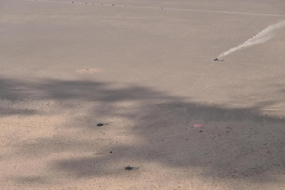 ↑2025年4月30日空中俯视神舟十九号载人飞船回来舱着陆现场。新华社记者 李鑫 摄